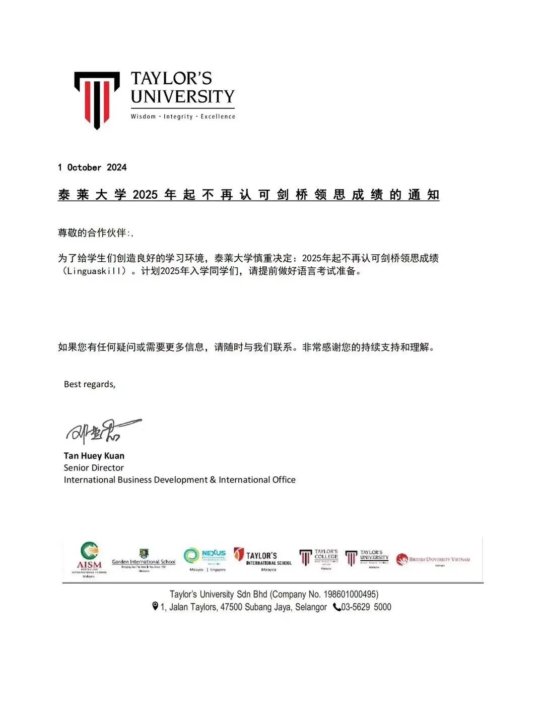 为了给大家营造良好的学习环境,泰莱大学经过慎重考虑,决定从2025年起不再认可剑桥领思成绩(Linguaskill)。计划于2025年入学的同学们,请提前做好语言考试准备,以确保顺利申请入学!